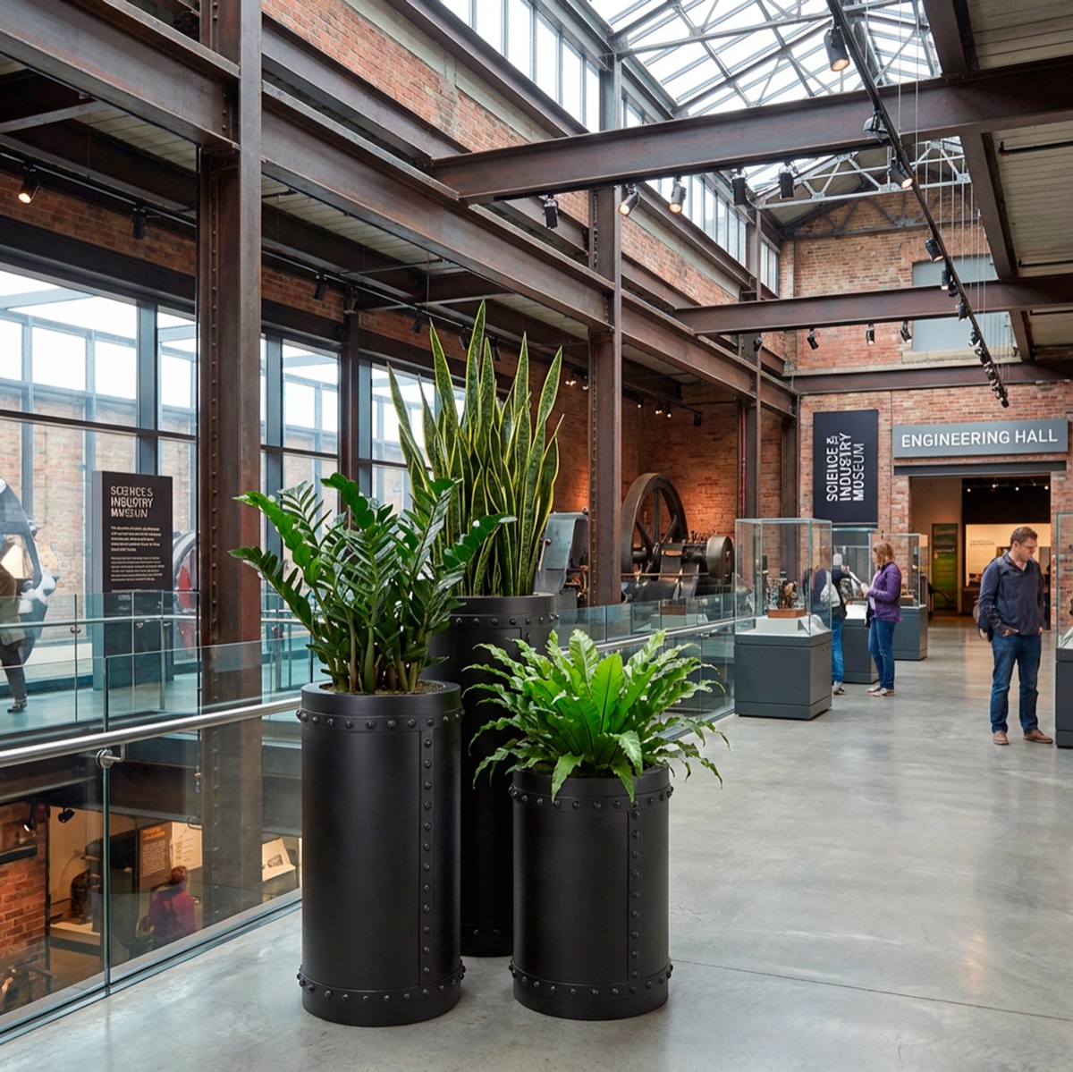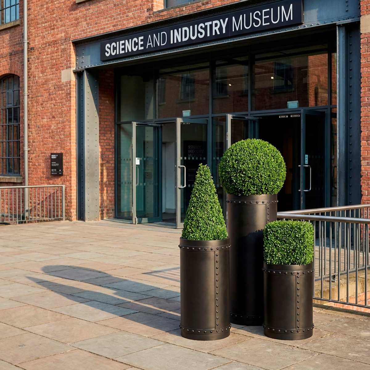 The CYL120 Rivets cylindrical GRP planter by Europlanters combines industrial rivet detailing with durable construction.