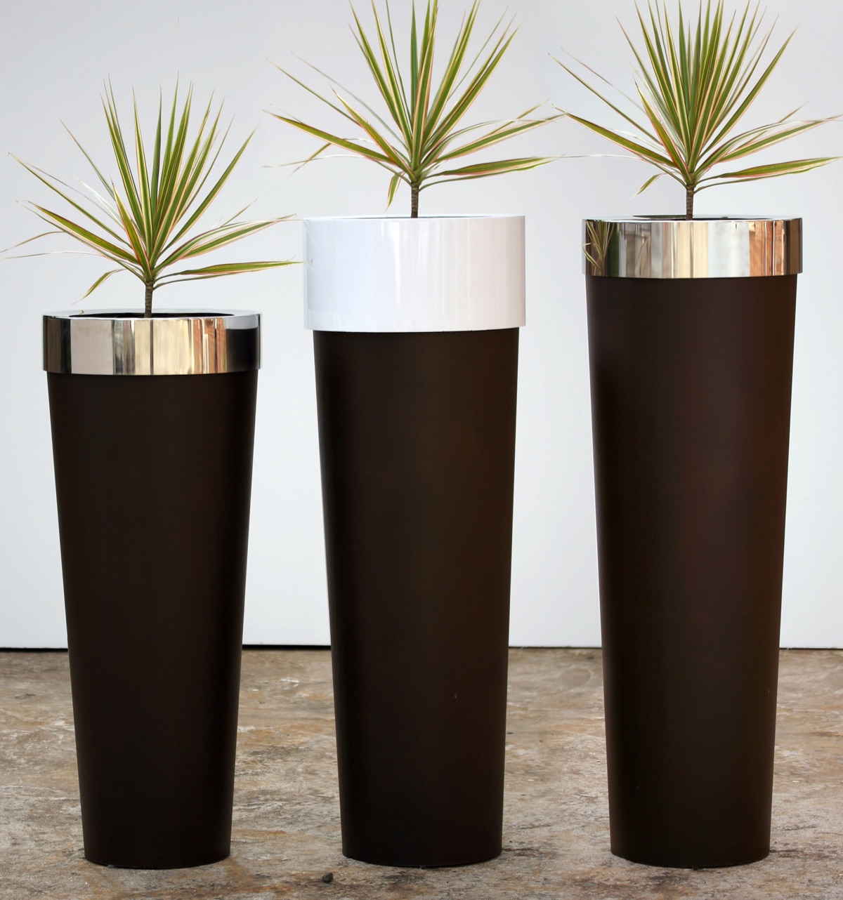 A smooth fiberglass round planter offering timeless circular form in a weather-resistant lightweight material.
